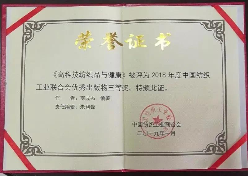 《高科技紡織品與健康》被評為2018年度中國紡織工業(yè)聯(lián)合會優(yōu)秀出版物三等獎!這是繼《功能紡織品(第2版)》被評為2017年度中國紡織工業(yè)聯(lián)合會優(yōu)秀出版物一等獎之后,商成杰教授的又一學(xué)術(shù)著作榮獲優(yōu)秀圖書大獎!