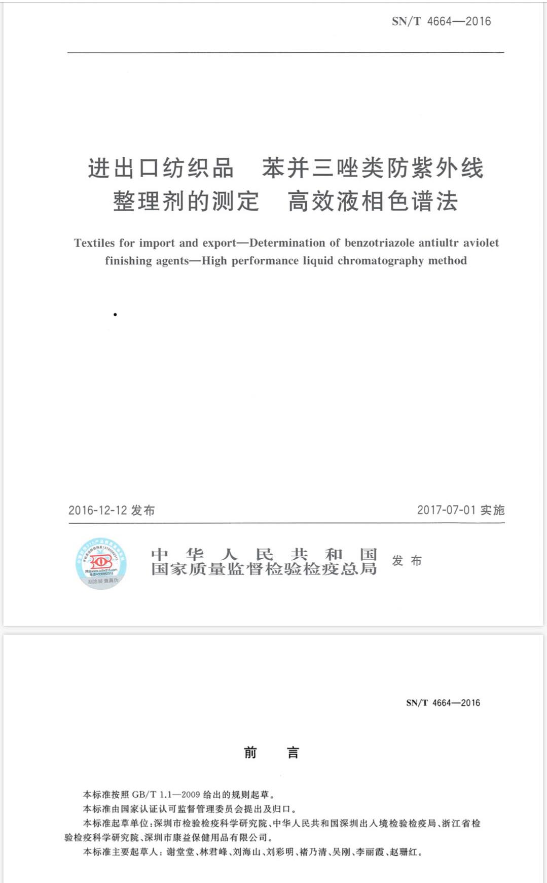 國家出入境檢驗檢疫行業標準《SN/T 4664-2016進出口紡織品 苯并三唑類防紫外線整理劑的測定高效液相色譜法》發布