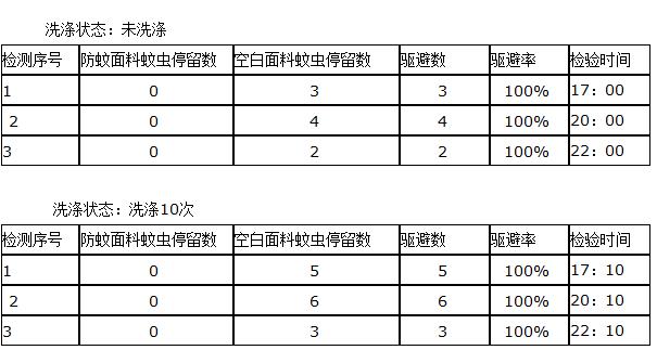 從以上表格可以看到防蚊蟲織物都有很好的蚊蟲驅避率, 經過處理的防蚊蟲織物有優良的耐洗滌性,洗滌后蚊蟲停落數仍能保持零,仍保持良好的驅蚊蟲效果。